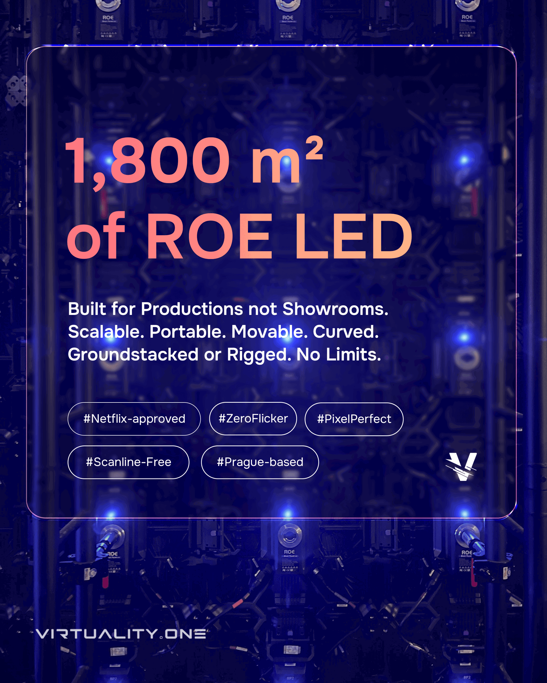 Virtuality.one is a Czech company focused on virtual production technology, premium LED solutions, and workflow support. We provide productions with ROE Visual LED panels, media servers, and the expertise to run them without compromise.