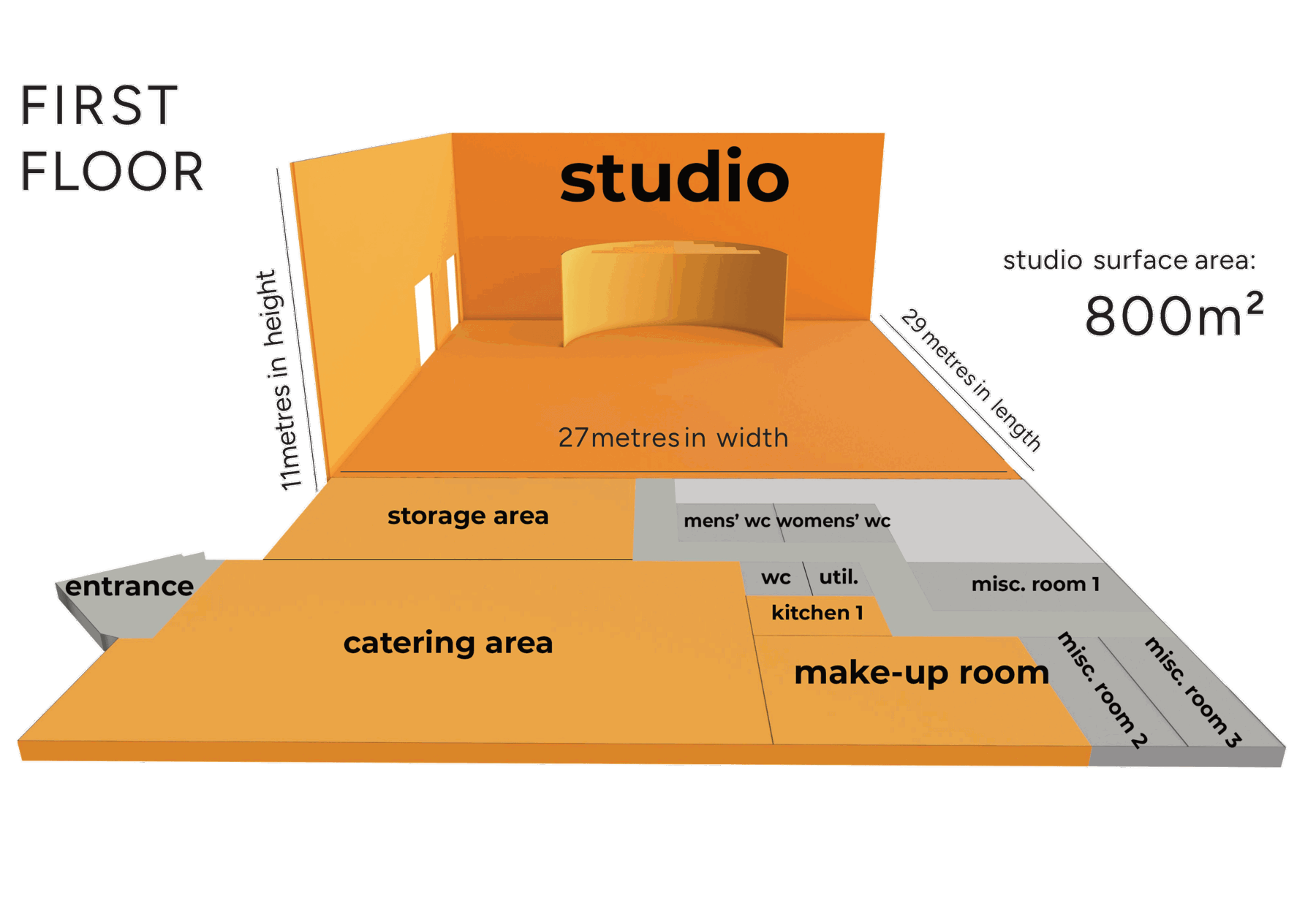 - Studio: Floor space 29m x 27m, 11m height, secure prep rooms inside the studio, makeup, catering, offices.....