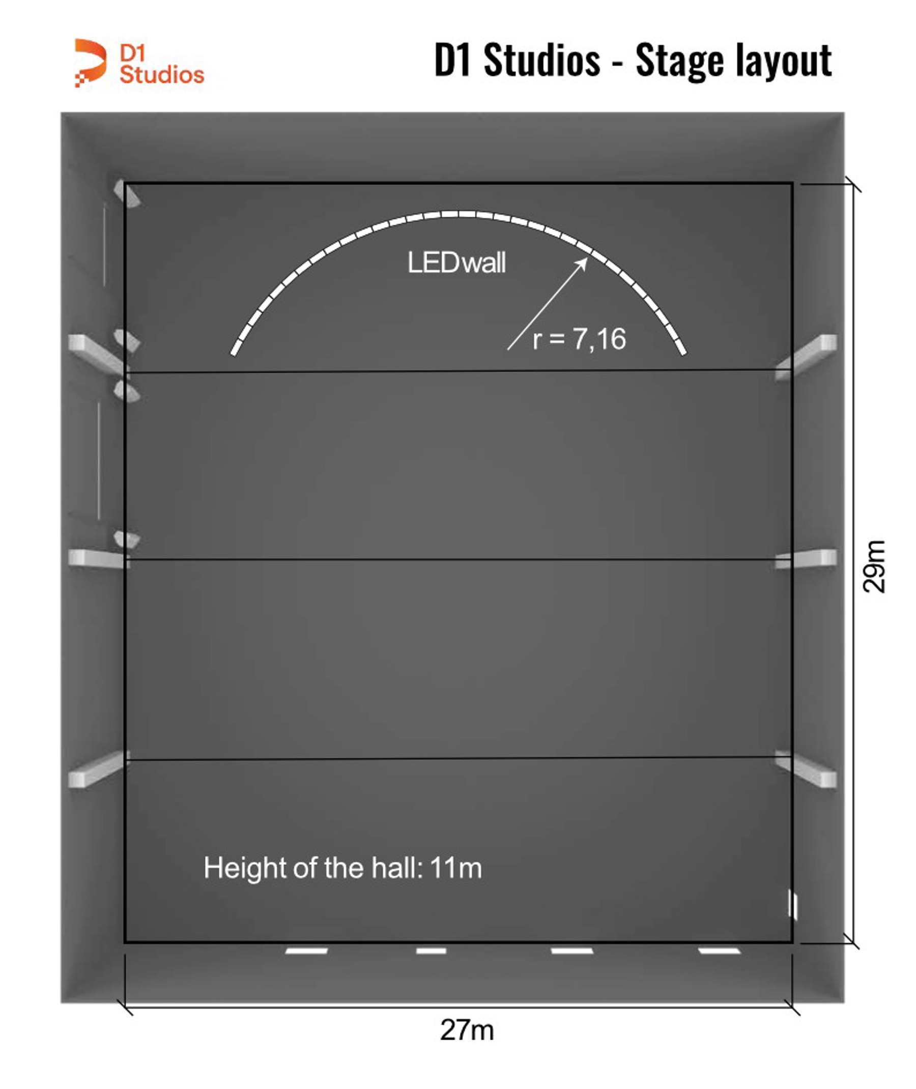 - LED wall: P2.6 1000nits, curves inward 180°, 14m diameter (24m x 6m), movable ceiling, dimensions can be extended depending on technical needs.